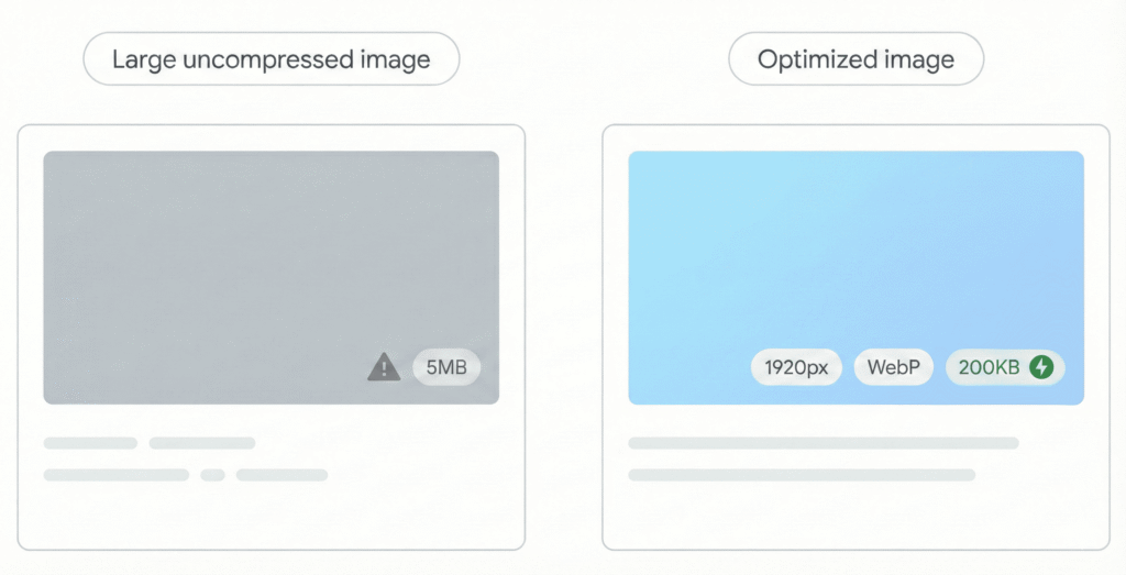 1. Resize before upload: Hero images: max 1920px. Standard images: 1200px or less. Never upload 5000px stock photos as-is.