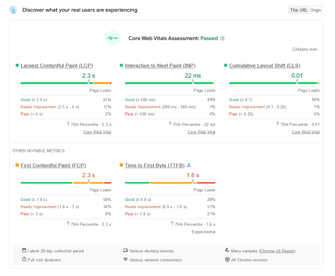 - Pages and sites must meet a minimum level of popularity based on visitor numbers. CrUX tracks the popularity of the entire website at the origin level (e.g.,