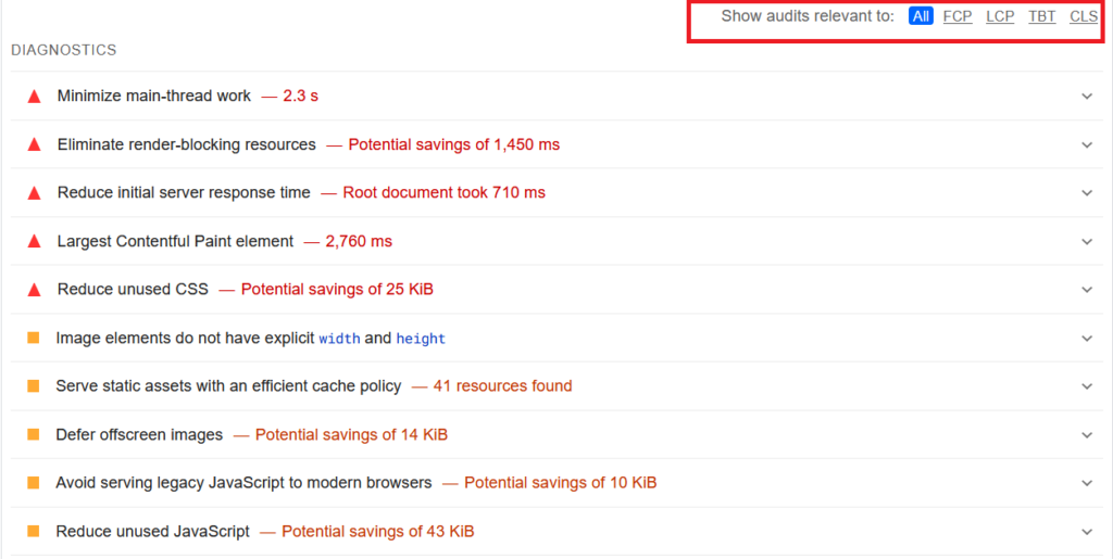 You can filter relevant audits above the diagnostics list (see screenshot below), helping you assess and improve your site’s metrics, even without field data.