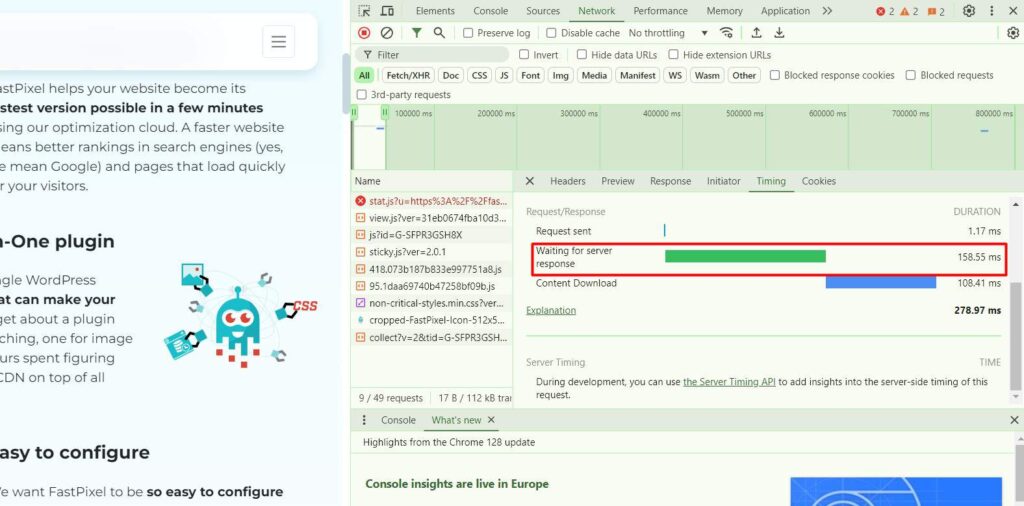 Finally, make sure you’re using an accelerator plugin like FastPixel that can help cut down on the amount of data your site processes during the initial load, which can help lower your TTFB.