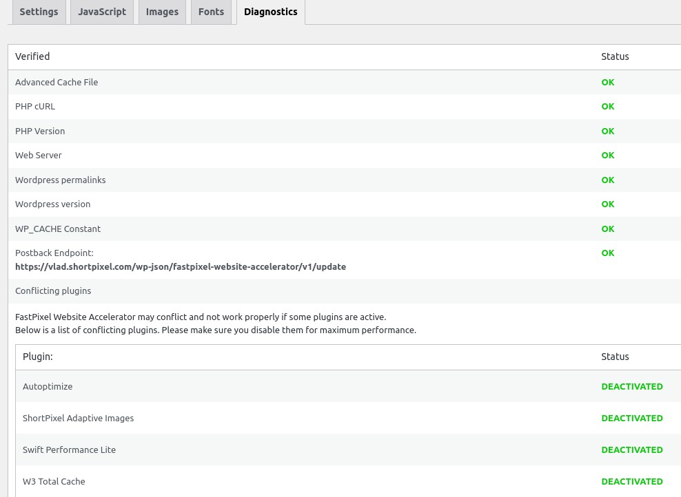Last on our list is the Diagnostics Tab – Here you will find out if you have any WordPress plugin conflicts, see the debug information and status of FastPixel.
