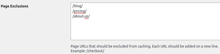 Page Exclusions – This option allows you to exclude pages from the caching/optimization process, leaving them